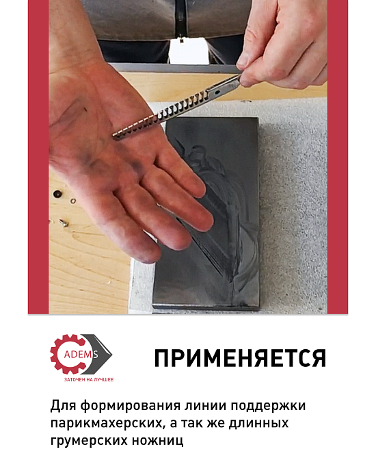 ADEMS Ride line — незаменимый инструмент для заточки и формирования поверхности поддержки изогнутых ножниц, используемых грумерами и ветеринарами.